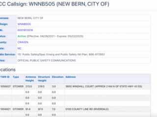 Now lets click on New Bern Public Safety. Under Sites and Frequencies click on the words “New Bern”. On the next page look at where it says “FCC Call Signs” at the bottom of the first table. Now click on “WNNB505”. That then takes you to a page with a table showing how many antenna towers there are. In New Bern there are two antenna towers. 2 antennas = SIMULCAST