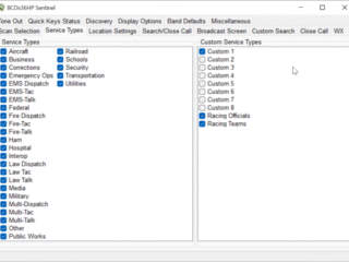 The next box is Service Types. This is maybe the most important one. I just enable them all. When you do that and Monitor Full Database you are in for a treat. You’ll grab about every damn radio transmission out of the air near you. Your scanner will scan SLOWLY though and you’ll miss stuff. And it will catch all manner of analog static and stop in a about a million places and you’ll have to hit the Avoid button to move past it. If you program in Railroads as I did and the Railroad Service type is not checked………..you won’t be “working on the railroad”.