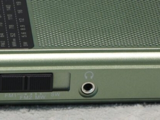 Band selection is location on the left side of the radio and has 4 steps. FM1, FM2, MW, SW. Next to the band selector is the headphone jack.